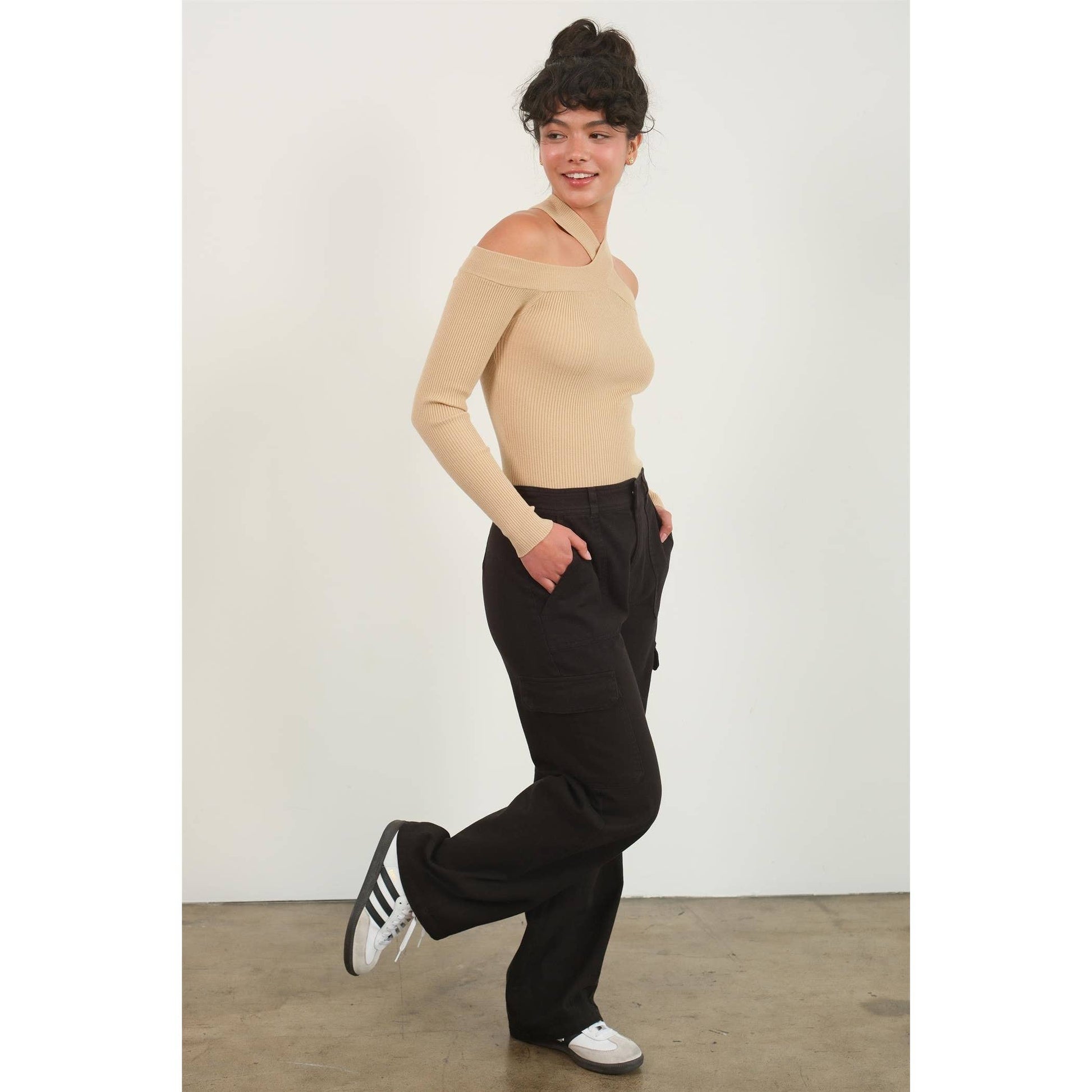Take your wardrobe to new heights with this ribbed knit top that adds an air of modern elegance to any outfit. Featuring a unique cross-neck design and off-shoulder style, this fitted top is perfect for a fun night out or a stylish daytime look. Pair it with high-waisted pants or a skirt to elevate your fashion game and stand out with a chic, sophisticated ensemble.